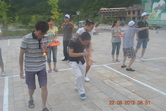 群山間開(kāi)辟場(chǎng)地,成為我們拓展訓(xùn)練的主戰(zhàn)場(chǎng)。訓(xùn)練場(chǎng)上培養(yǎng)的是我們之間的團(tuán)隊(duì)合作、協(xié)同的精神。為此公司為我們精心準(zhǔn)備了“單腳火車(chē)跑”、“吸乒乓球賽”、“雙人合作夾球接力賽”等豐富的活動(dòng)內(nèi)容。