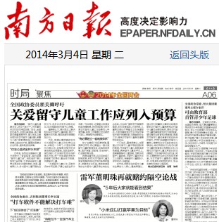 南方日報(bào)訊 “留守兒童的健康成長,涉及千家萬戶,關(guān)系著未來農(nóng)村的可持續(xù)發(fā)展!弊蛉,全國政協(xié)委員、全國婦聯(lián)常委、香江集團(tuán)總裁翟美卿呼吁,要從根本上解決現(xiàn)階段農(nóng)村留守兒童問題,單靠幾個(gè)部門的職責(zé)擔(dān)當(dāng)以及民間的慈善公益遠(yuǎn)遠(yuǎn)不夠,重要的是建立長效機(jī)制、提供制度性保障。